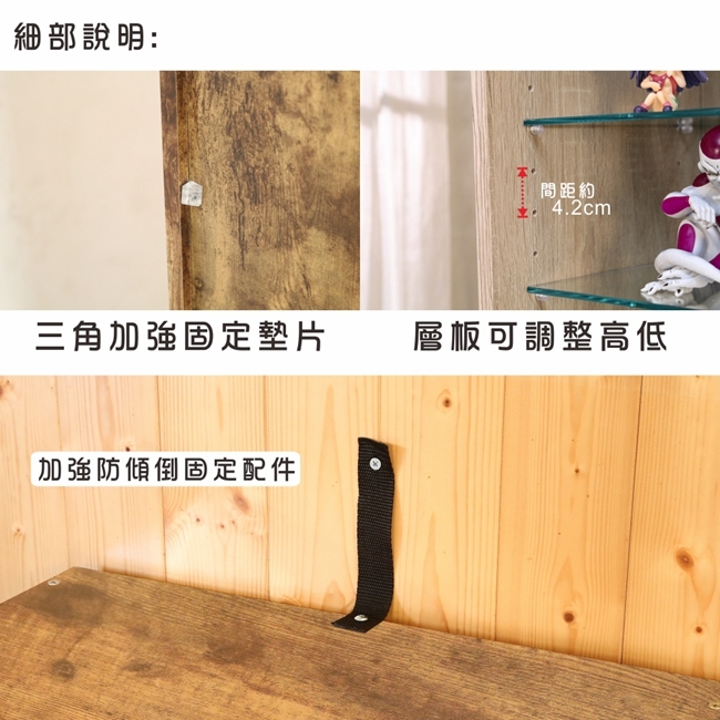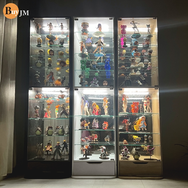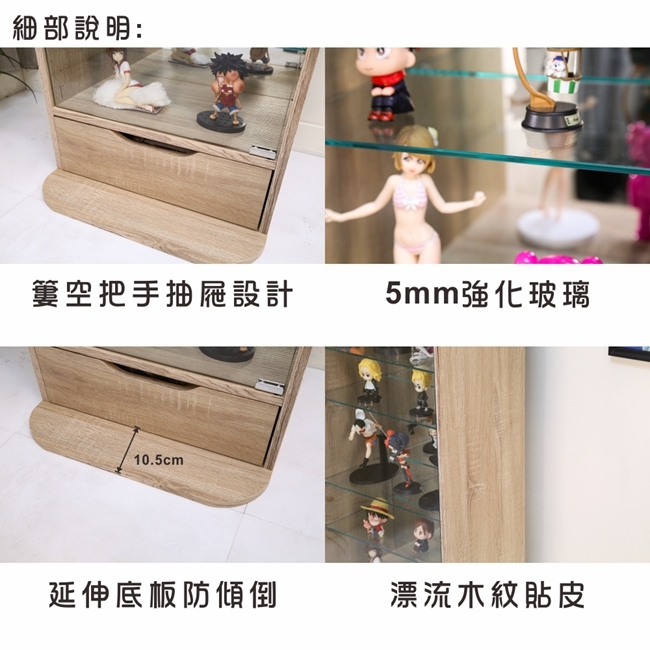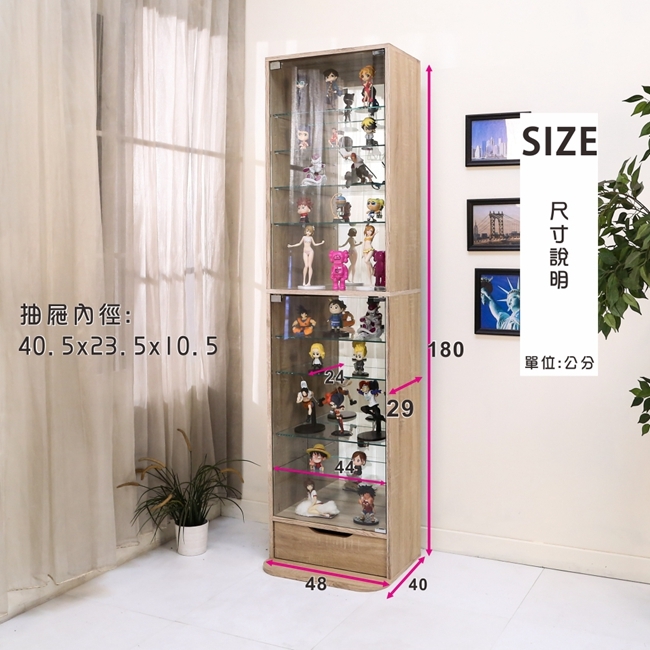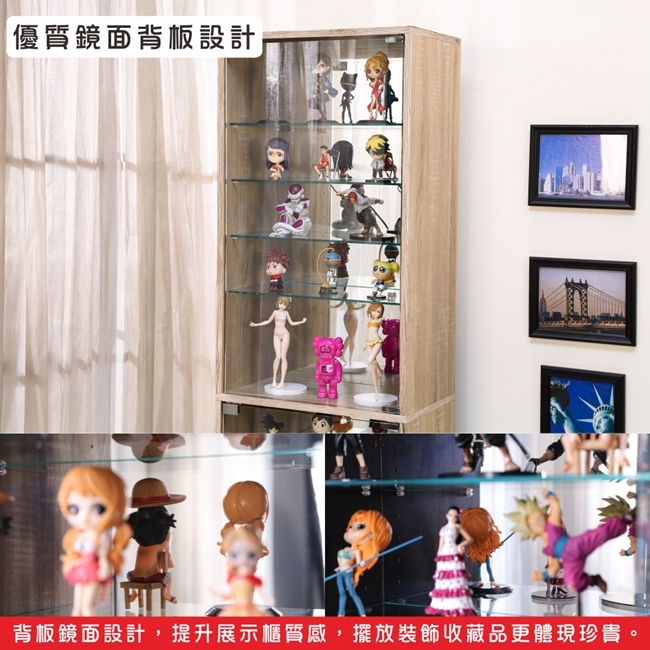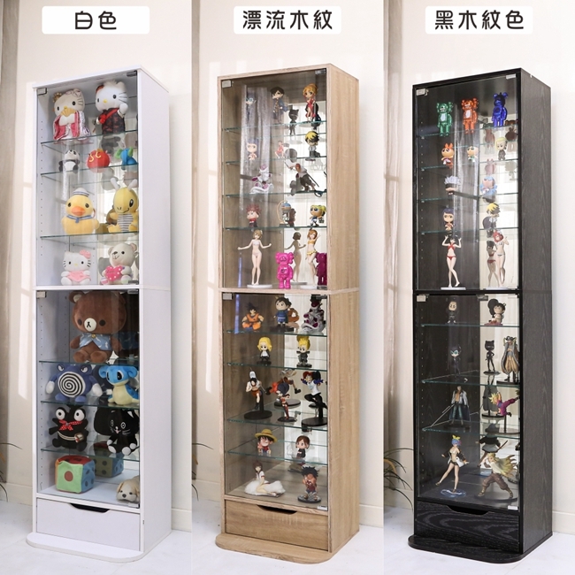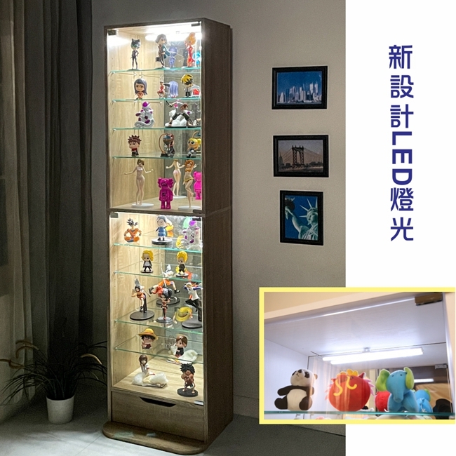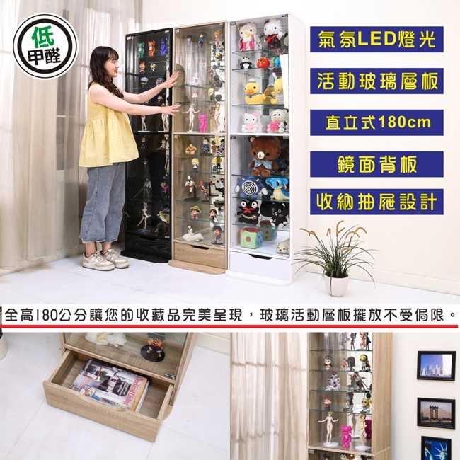 讓公仔們有個家吧,放到展示櫃裡擺放觀賞,朋友來時可以一同分享收藏,同時也可以裝飾家中的角落,全高180cm讓您完美呈現收藏品,8片玻璃活動層版可自由調整讓擺放不受限,按壓式玻璃門採用5mm強化玻璃,既安全又美觀,還不用擔心灰塵髒汙附著。這款升級版將背板改為鏡面,上下櫃各安裝1個LED燈,夜晚燈光投射展品上,鏡面反射展品及光線,更顯光彩奪目。底部增加抽屜,可收納小物品。底部10.5cm防傾倒底板延伸可使整體更加穩固,此外整體板材使用低甲醛E1健康板材,讓您用的安心。不只可以放玩具公仔模型也可以當書櫃用或放小朋友的娃娃,如此多功能的櫃子,是家中不可或缺的好物。