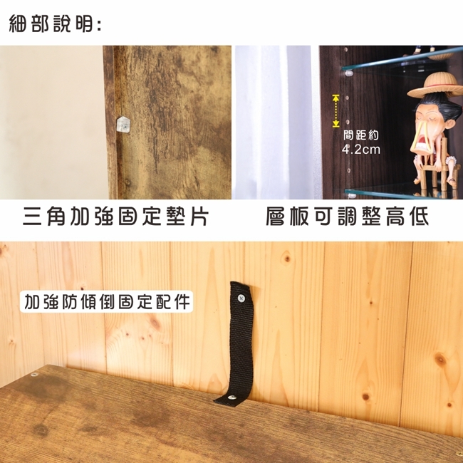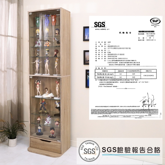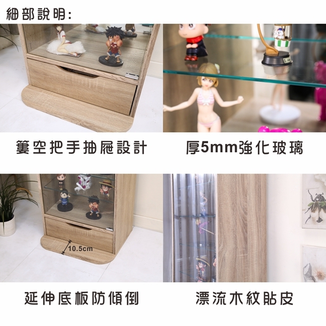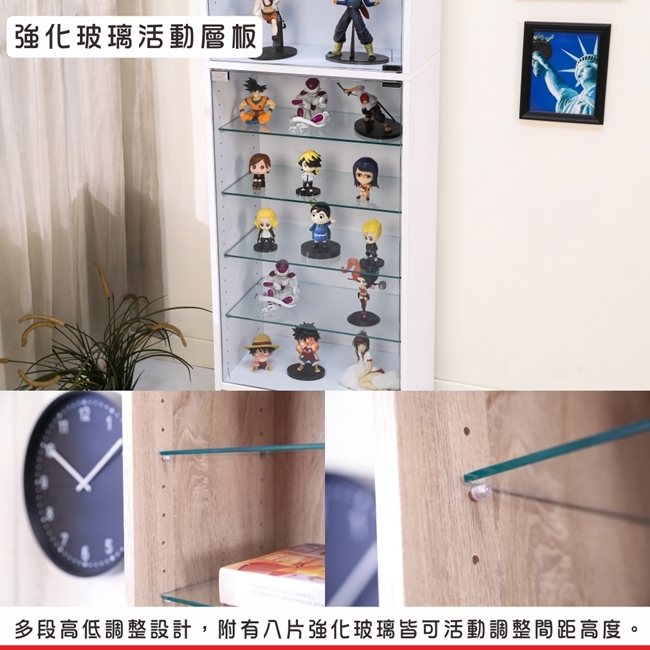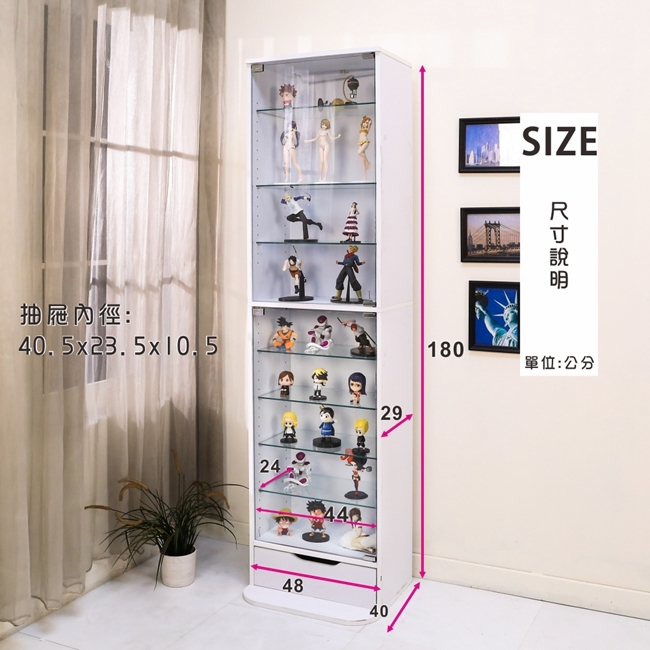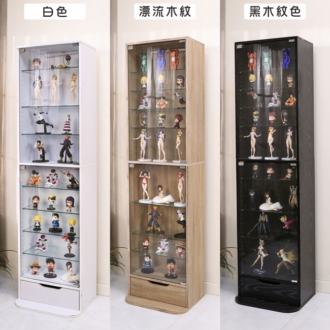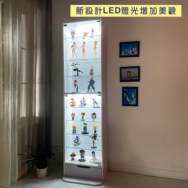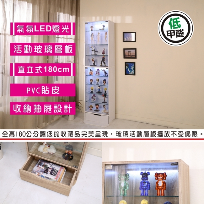 讓公仔們有個家吧,放到展示櫃裡擺放觀賞,朋友來時可以一同分享收藏,同時也可以裝飾家中的角落,全高180cm讓您完美呈現收藏品,8片玻璃活動層版可自由調整讓擺放不受限,按壓式玻璃門採用5mm強化玻璃,既安全又美觀,還不用擔心灰塵髒汙附著。這款上下櫃各安裝1個LED燈,夜晚燈光投射展品上,更顯光彩奪目。底部增加抽屜,可收納小物品。底部10.5cm防傾倒底板延伸可使整體更加穩固,此外整體板材使用低甲醛E1健康板材,讓您用的安心。不只可以放玩具公仔模型也可以當書櫃用或放小朋友的娃娃,如此多功能的櫃子,是家中不可或缺的好物。