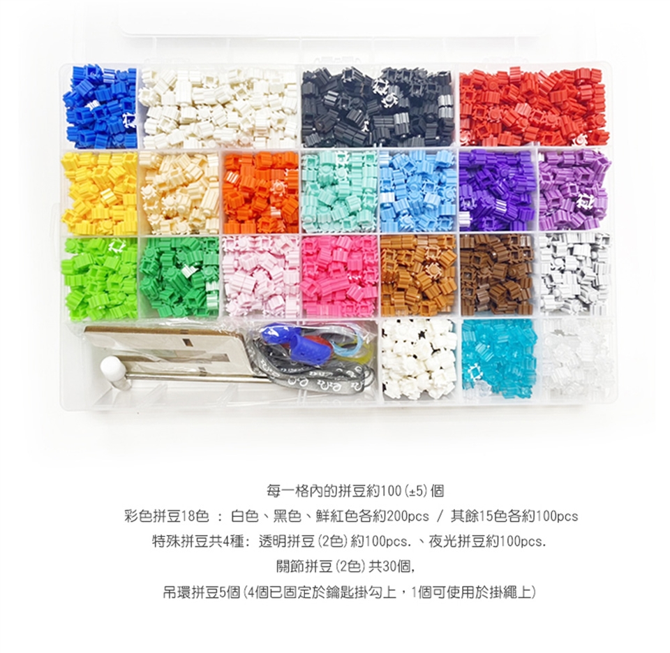 - 彩色拼豆(18色) : 白色、黑色、鮮紅色各約200pcs / 其餘15色各約100pcs
