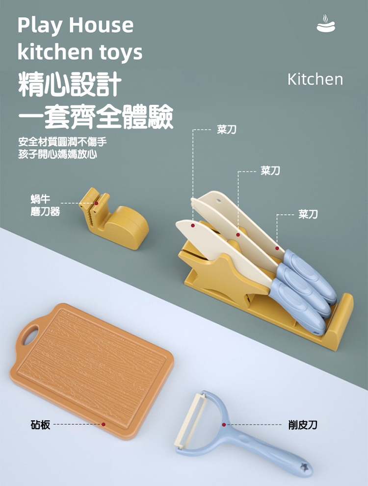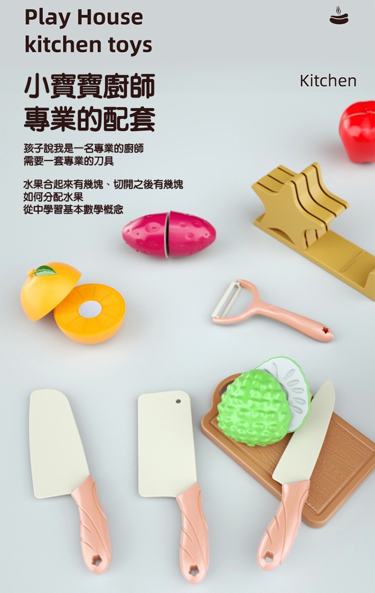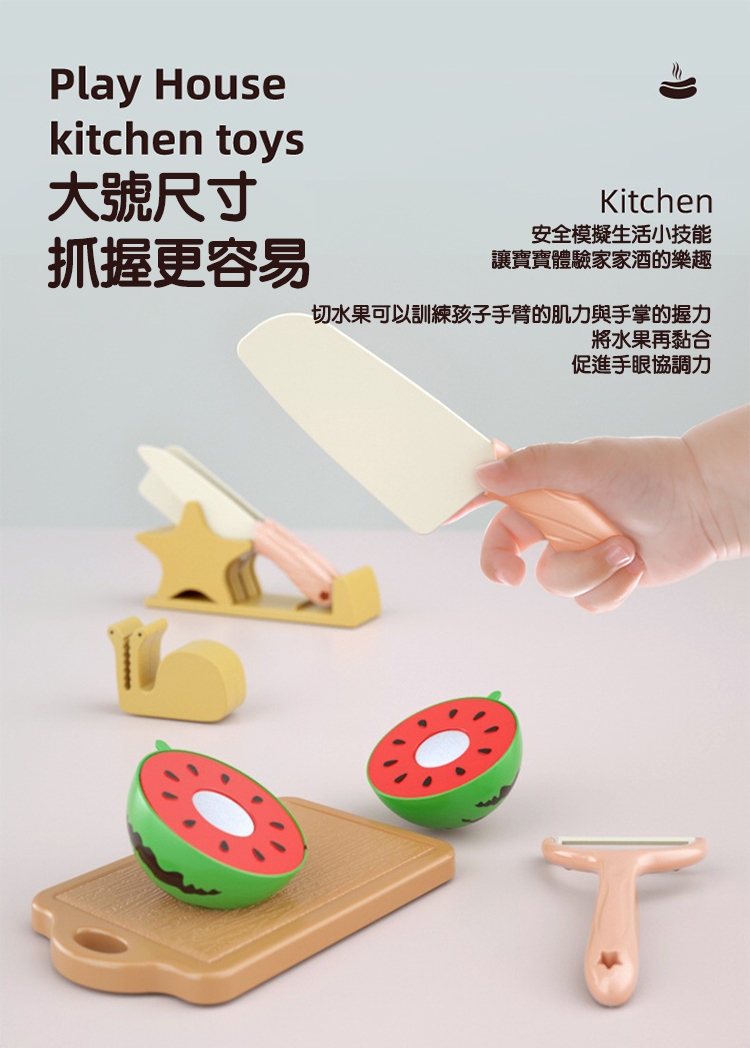 切水果可以訓練孩子手臂的肌力與手掌的握力,將水果再黏合,促進手眼協調力。
