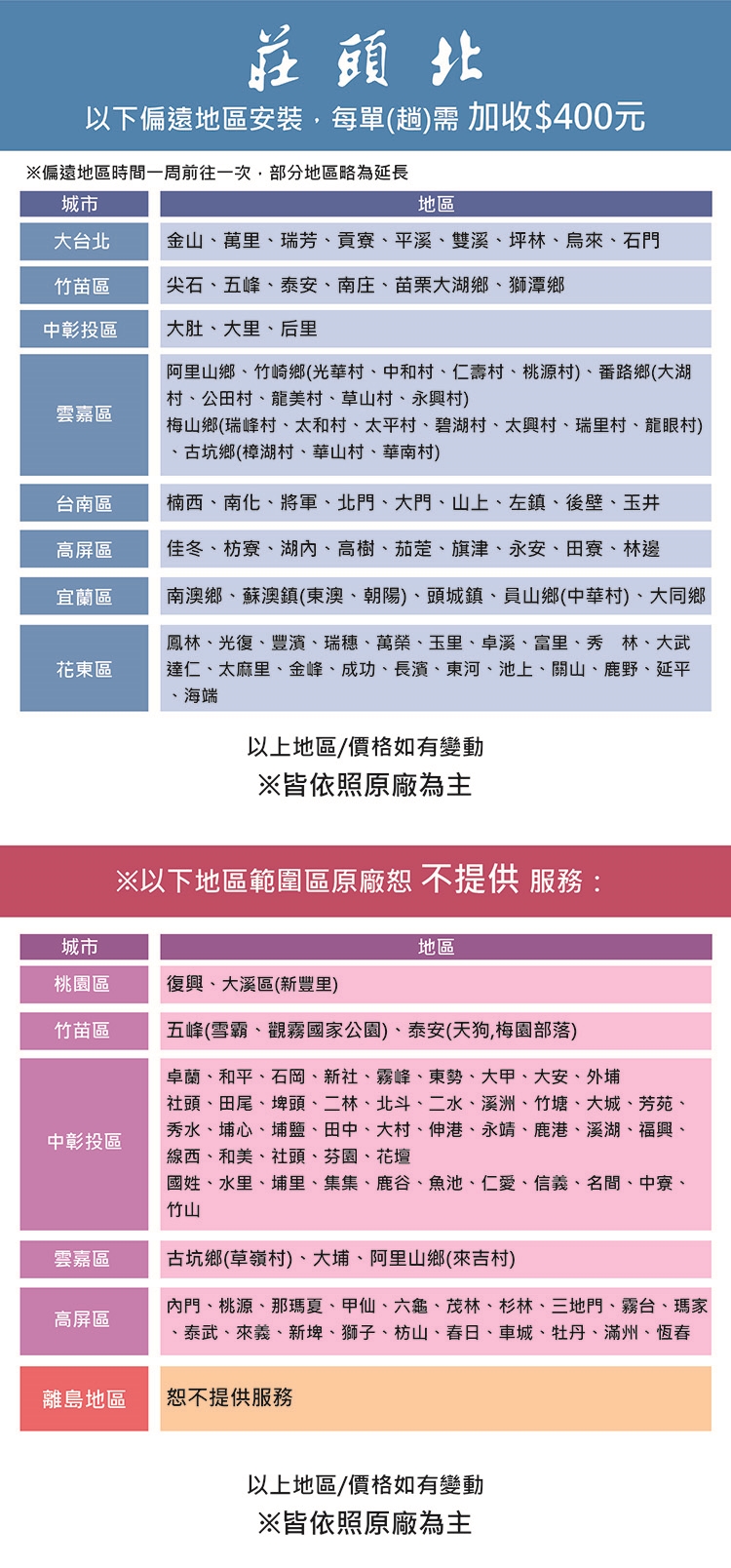 基本安裝範圍:以原廠商品箱內所附之零件安裝,無挖孔洞、割玻璃、拆廚櫃、水泥工程、配電線|管線|重新配線施工等服務,如有加購它類配件,則以技師現場報價另外酌收費用為準。