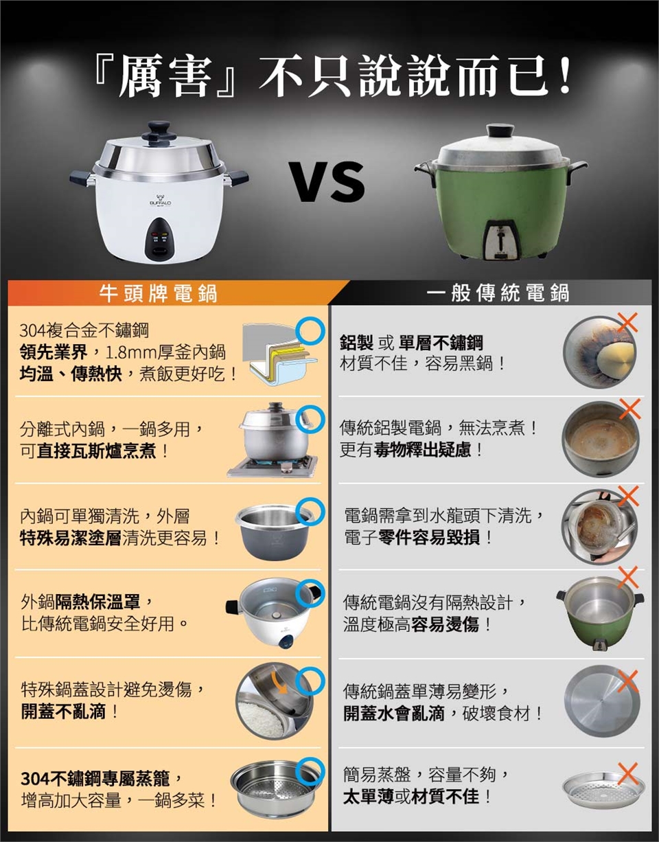 厲害電鍋和傳統電鍋蒸煮法一樣,只是又多了更多料理方式,可以參考YT影片烹飪示範。