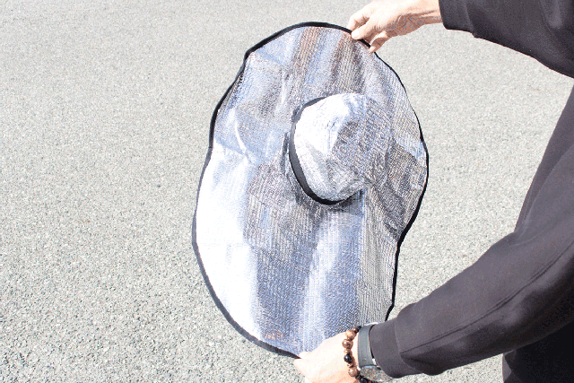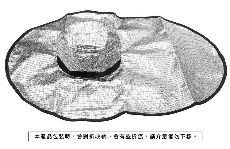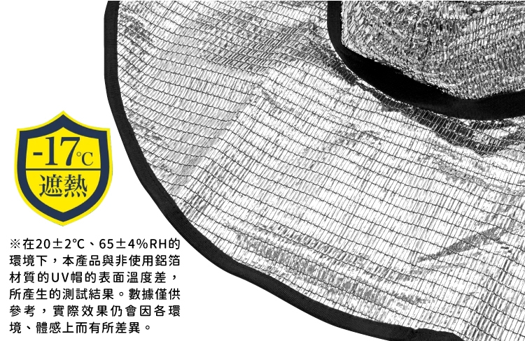 ●鋁箔除了反射紫外線外,還能隔熱,經測試,與非鋁箔材質的帽子表面有最高高達17度的溫度差距。