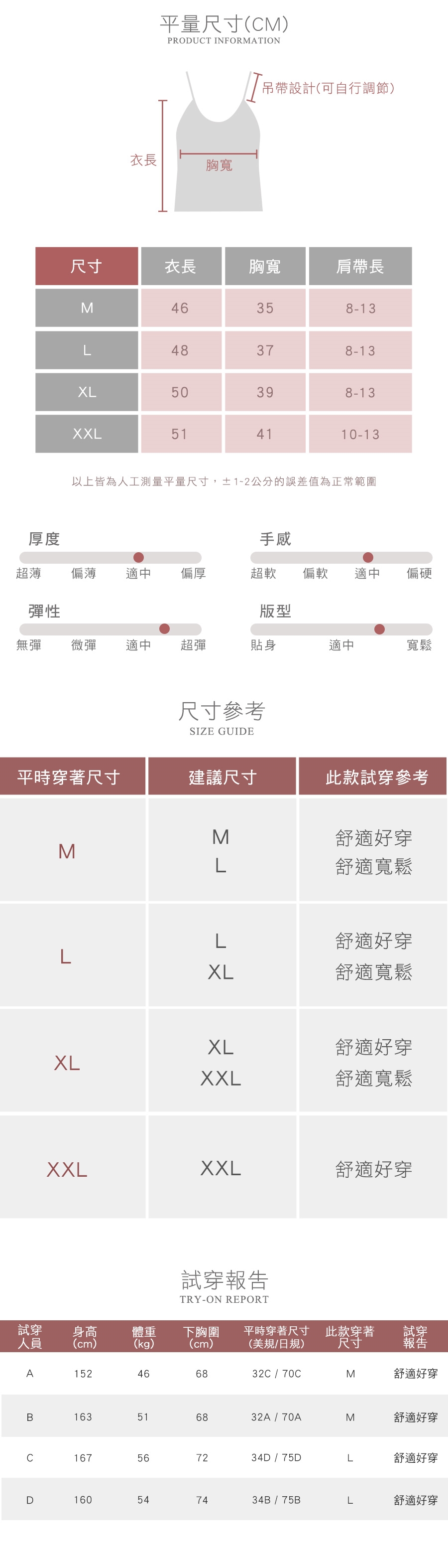 ◆商品有10天審閱期(注意!鑑賞期非試用期) ◆如需退換貨請保持商品完整,(包含購買商品、附件、內外包裝、贈品等)請一併寄回,否則將會影響退貨權限。 ◆內衣褲屬貼身物品,辦理退換貨時,除商品本身瑕疵外,一經剪標或下水恕不接受退換貨。 ◆網頁商品會因為使用不同的品牌螢幕以及解析度不同,造成圖片顏色呈現略有不同,請以實品顏色為準。 ◆本尺寸對照表標示僅供參考,實際尺寸以實品為準。 ◆請用中性洗潔劑冷水手洗,洗淨後請輕扭後置於陰涼處晾乾。請勿使用漂白劑。
