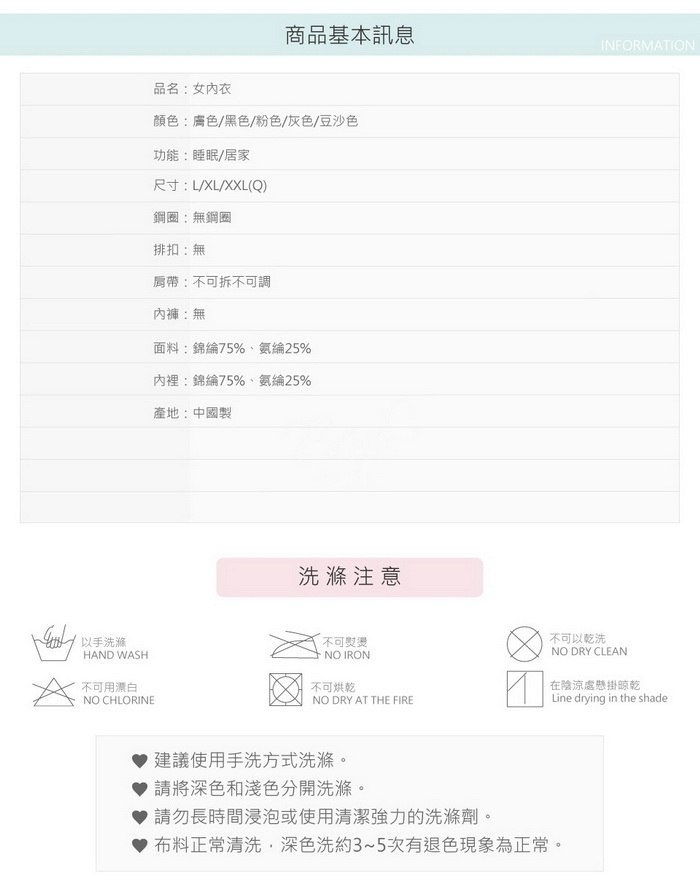 ♥貼心小叮嚀br/‧洗滌時建議使用中性洗潔劑手洗,不可長時間浸泡再洗滌。br/‧請勿放置洗衣機中攪拌及脫水,避免洗衣機破壞物品的纖維。br/‧洗滌前請先將拉鍊、扣鉤鉤上,避免洗滌時損傷到衣物。br/‧請以冷水或40度C以下的溫水清洗。br/‧請用手指按洗或輕揉髒污部位,請勿扭絞衣物。br/‧清洗完畢,請先平整衣物,再放置於通風陰涼處晾乾。br/‧請避免陽光直接照射,以防止衣物彈性鬆弛或組織脆化。