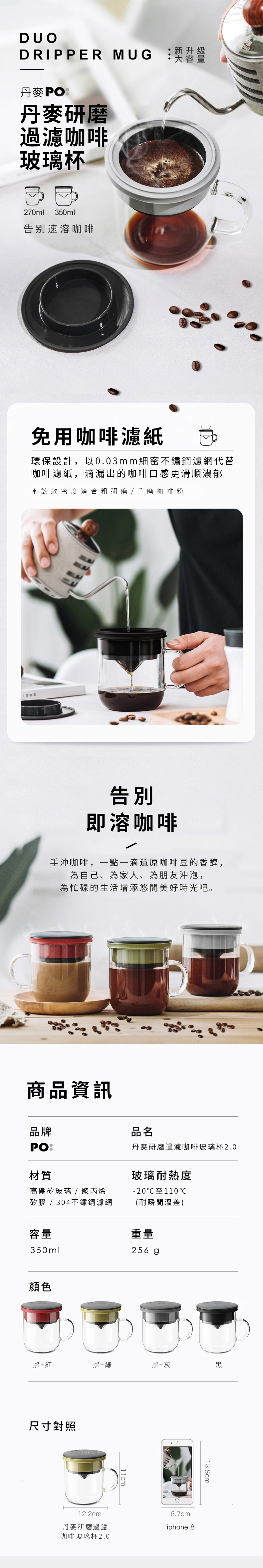2/ 350ml玻璃杯,正配合濾網”2CUP”粉量建議的水量並可隨心調整濃淡