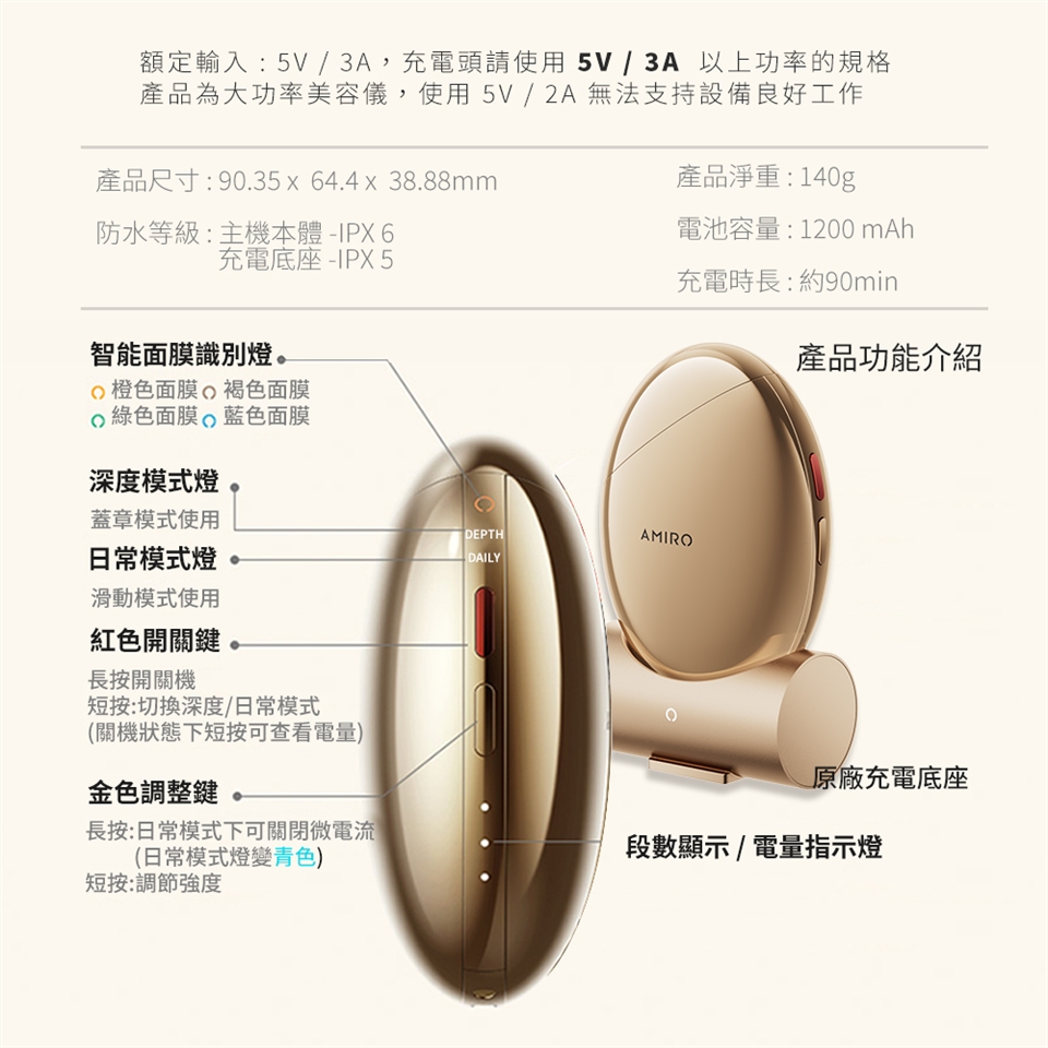 充電頭請使用 5V / 3A 功率的規格,產品為大功率美容儀 使用5V / 2A 無法支持設備良好工作
