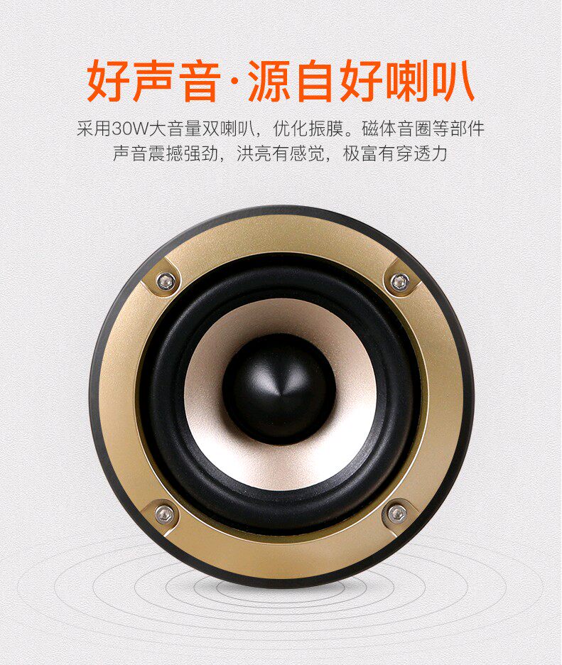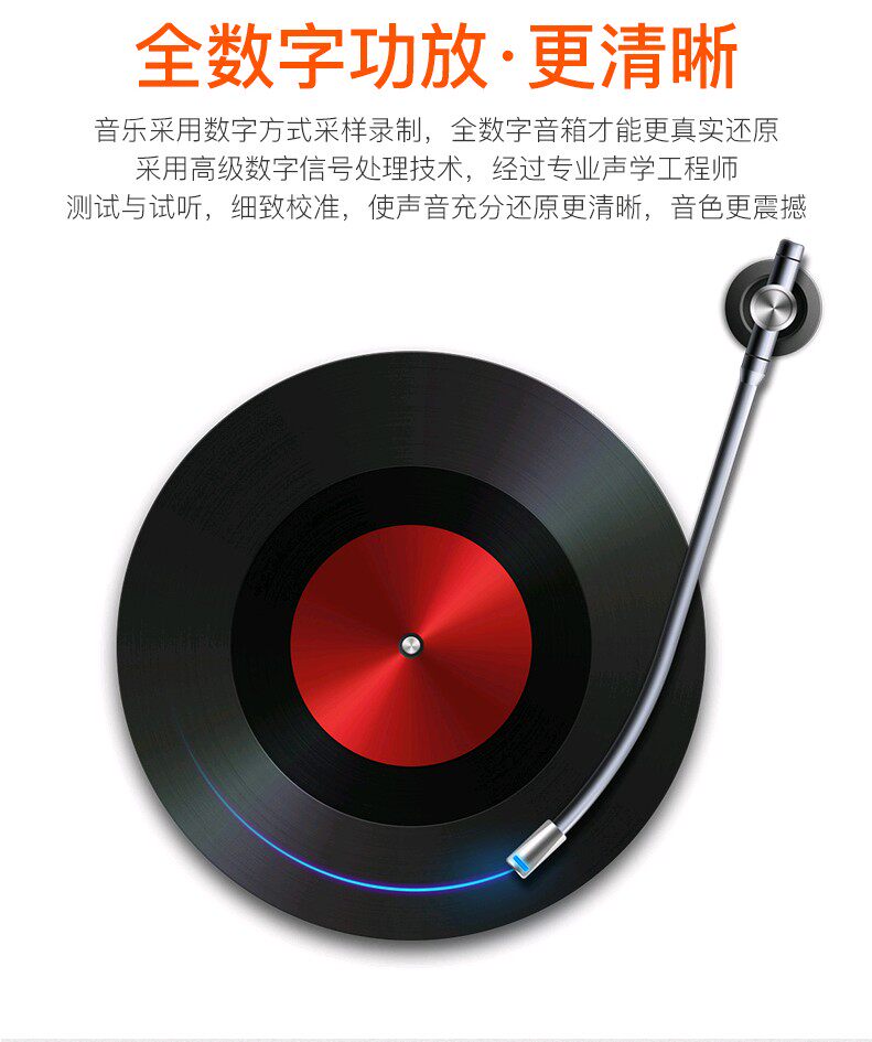 音響內置了fm調頻,沒事的時候泡壺茶聽聽廣播愜意自得。全新改版的usb接口可以無損播放MP3 WMA FLAC文件格式,配合全數字功放及美國DSP定制獨有的調音,完全可以勝任各種音樂風格,滿足各類不同需求的發燒音樂愛好者!