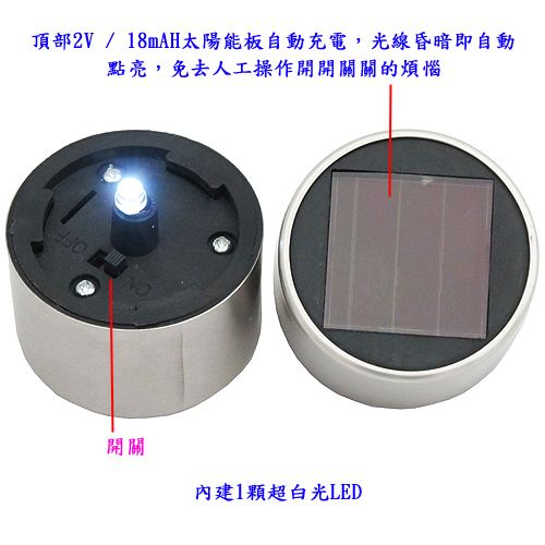 ■頂部2V / 18mAH太陽能板自動充電,光線昏暗即自動點亮,免去人工操作開開關關的煩惱。