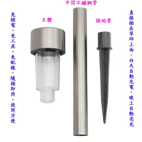 將2節插桿套入主體組裝好,將開關撥到”ON”的位置,將燈插到要安裝的位置即可。