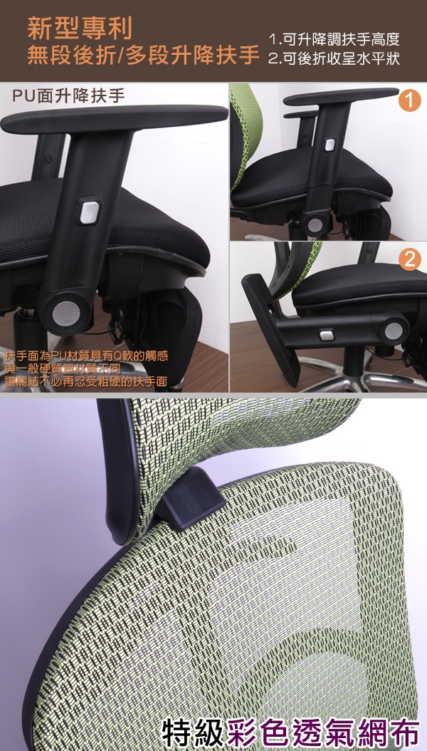 ◆新型專利軟質PU扶手-握感絕佳,具有升降&後收合功能,單鈕操作方便簡易