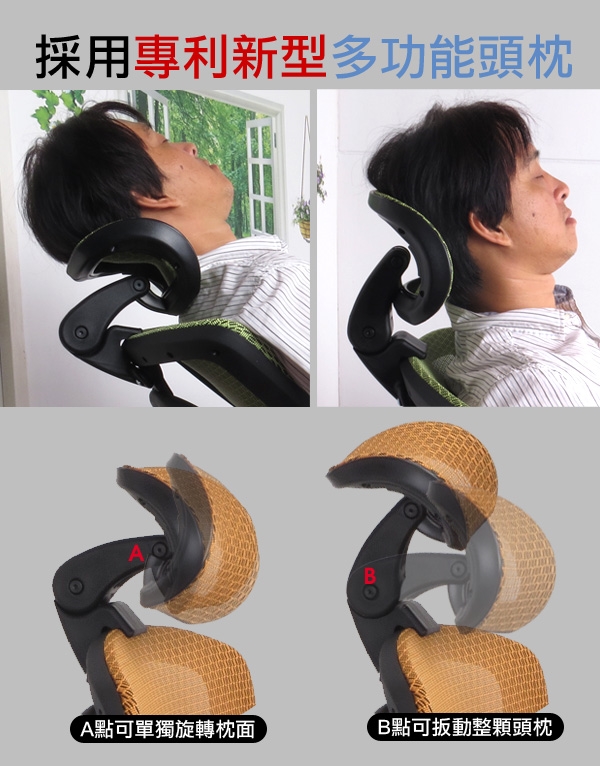 ◆新型專利頭枕可仰角度可變,腰部支撐減壓機構
