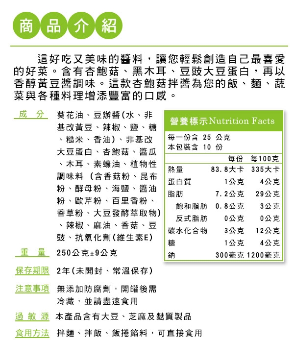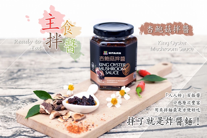 一點點的小辣,擁抱杏鮑菇、香菇、木耳、碎瓜、豆鼓,並佐以香醇的黃豆醬,可稱為「人人好」的百搭醬。