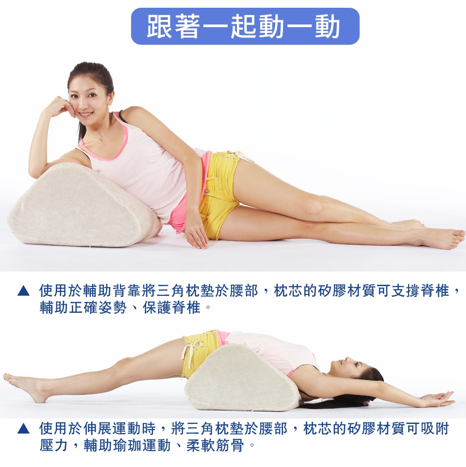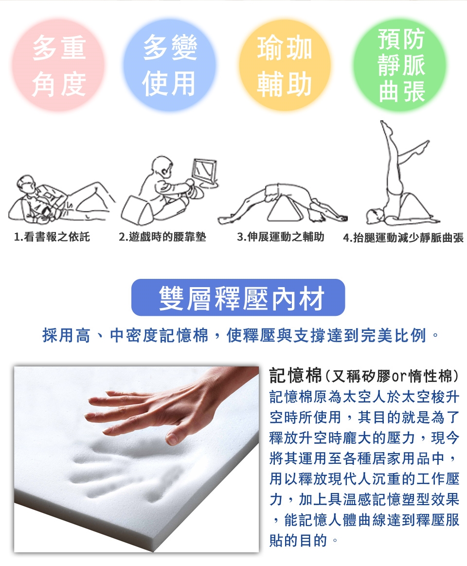 頂級釋壓新選擇,【LooCa】吸濕排汗萬用三角靠墊符合人體比例,吸收人體壓力,不論坐臥完全服貼支撐,長期同一動作維持也不會感到手酸腳麻,適合各種體型人士適用,三角枕之三面不同角度可適用躺臥坐靠等...各種姿勢,還可輔助完成腰部伸展動作。頂級矽膠材質與吸濕排汗表布結合,給你超舒適觸感及超完整釋壓。