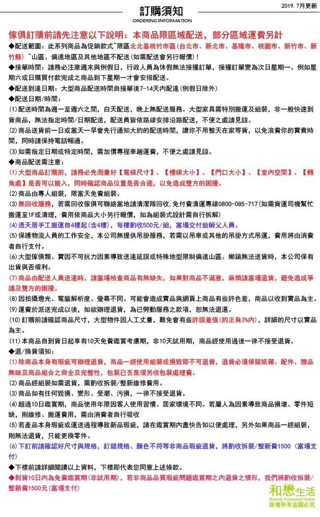 5.大型傢俱類、實因特殊地型限制偏遠山區、鄉鎮無法送貨時,本公司保有出貨與否權利