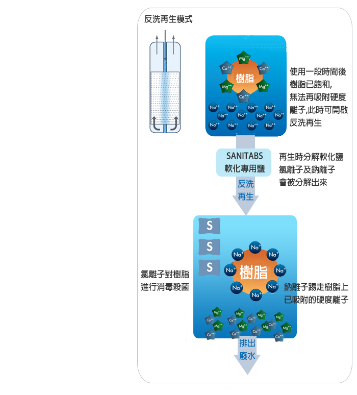 因離子交換樹脂中的交換容量有限,因此當樹脂的可交換容量用盡時,即必須進行反洗還原再生以確保交換的能力。