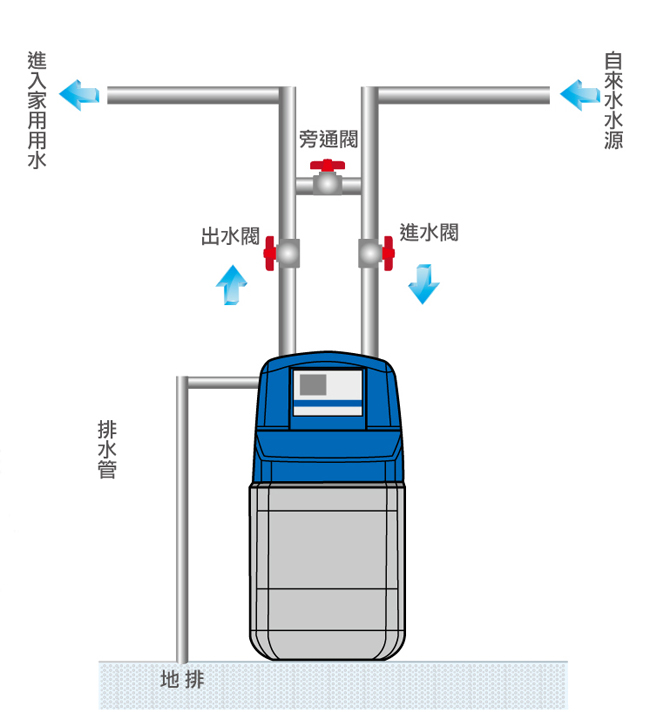 ‧ 再生時使用電磁閥開關設計,再生清洗時自動啟動旁通系統不怕沒水可用