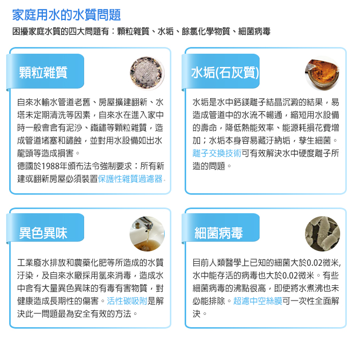 而水垢不僅僅是殘留在家中設備表面,當水中的雜質及水垢過多時,將可能會殘留在家人的皮膚表層,堵塞毛細孔,影響皮膚的新陳代謝。有效的改善水中的雜質及水垢含量,將可增進皮膚對保養品的吸收效能。鈣化及鏽蝕的管路還提供了水中各類細菌病毒的最佳孳生環境,對水質造成不易察覺的嚴重污染,對家人的健康造成影響。