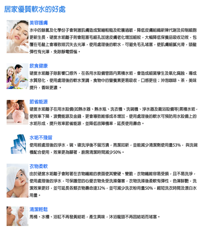 更重要的是,結垢情況的解決,家中不再有水管堵塞,水垢皂垢問題,同時也避免水垢(內藏細菌並孳生)對水質不易察覺的嚴重污染,而且衣物洗後柔軟,減少洗劑用量,還提供優質舒適的Spa級沐浴用水。