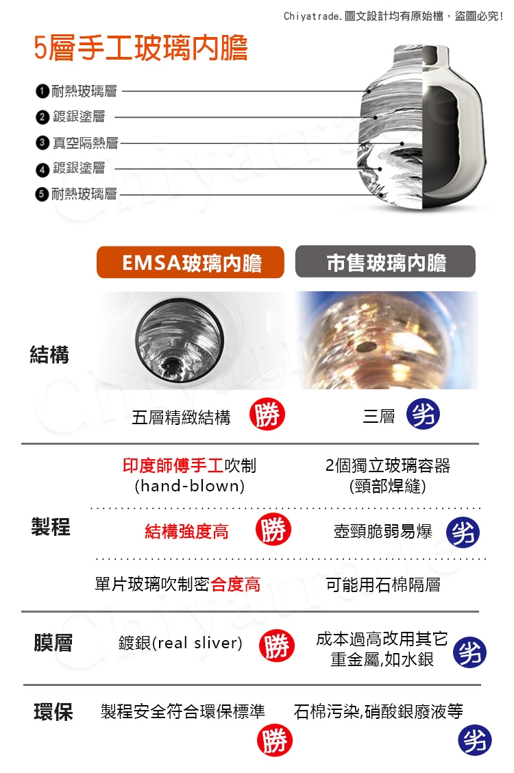 ◆堅持手工吹製的玻璃內膽,五層結構保溫效果更優異。