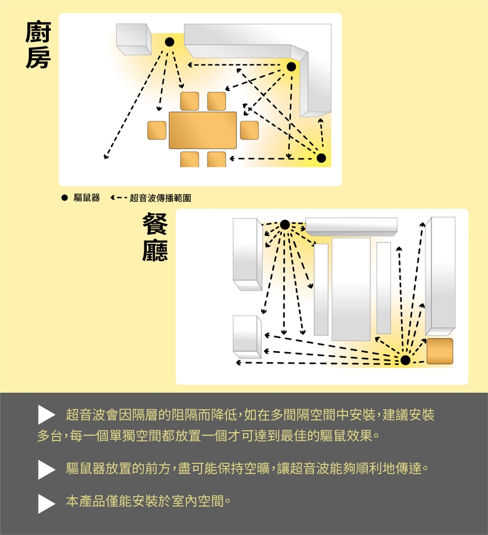 如果是在多隔間的空間安裝時,建議安裝多台驅鼠器,