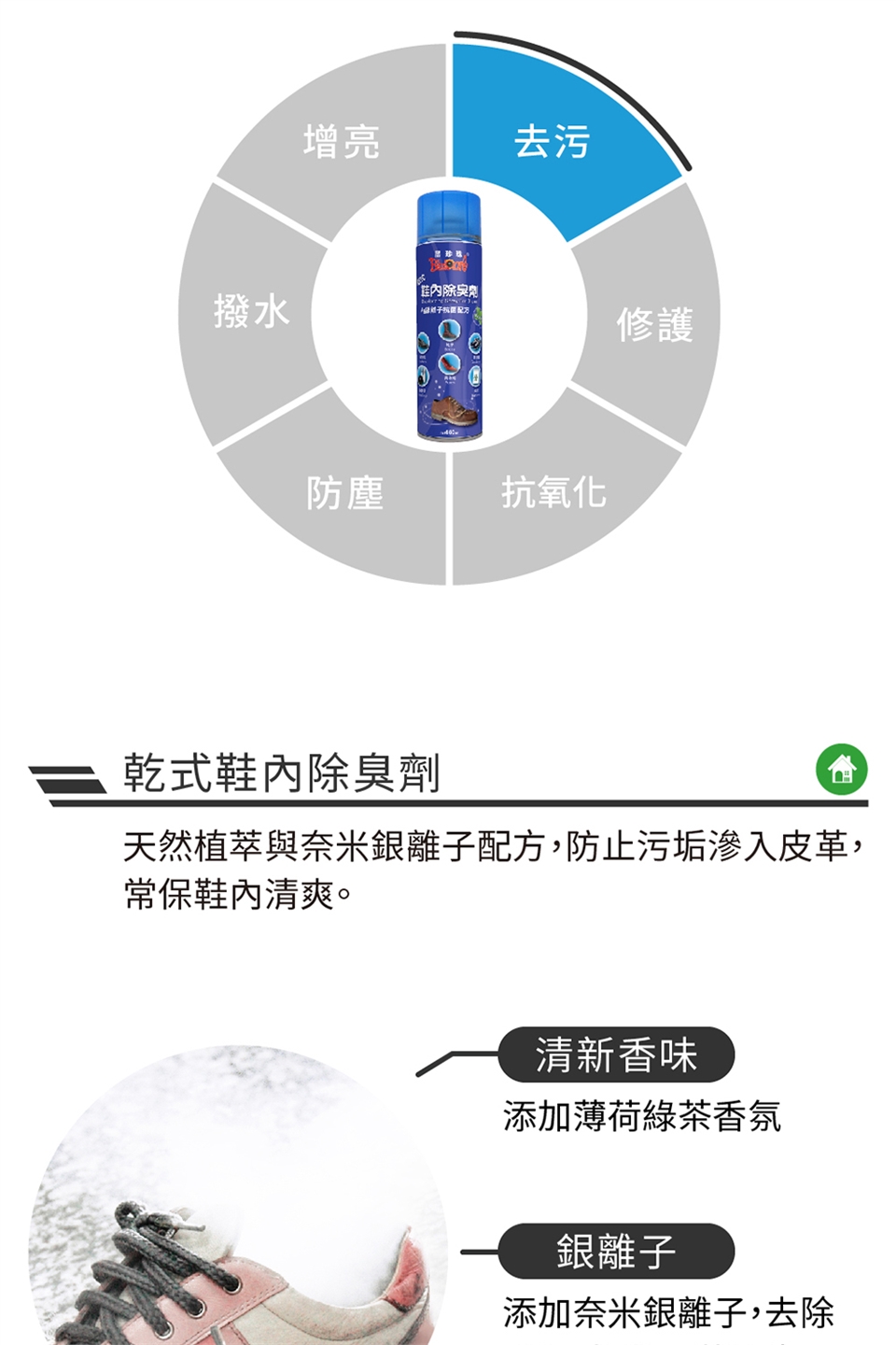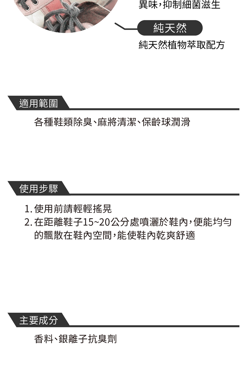 2.在距離鞋子15~20公分處噴灑於鞋內,便能均勻的飄散在鞋內空間,能使鞋內乾爽舒適。
