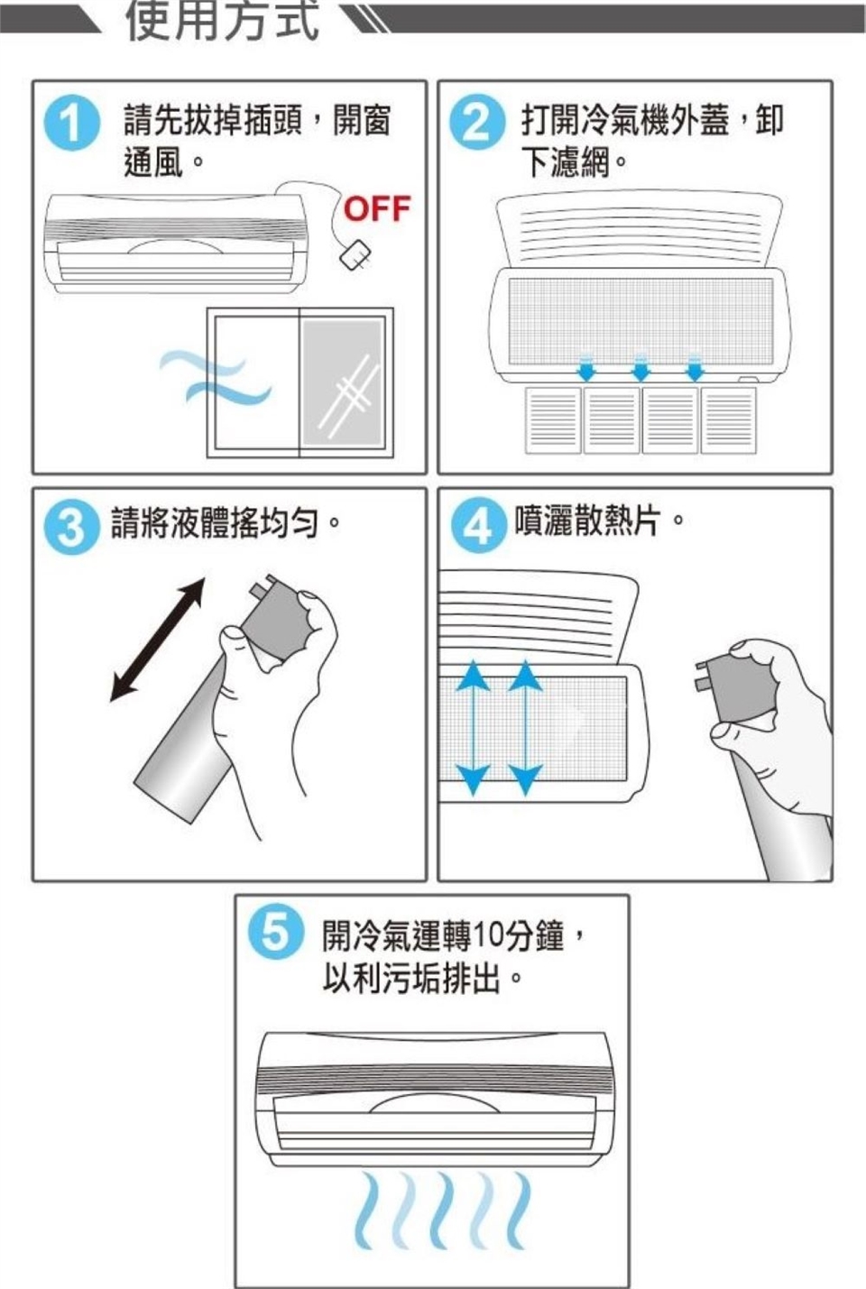 7.清洗空調冷氣機冷卻葉片,適用於排水管的空調機,不滴水機型請勿使用.