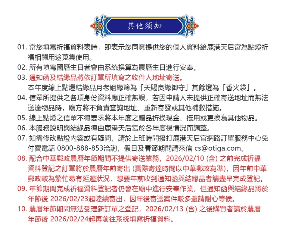 9. 農曆年節期間無法受理新訂單之登記,2026/02/13日(含)之後購買者請於農曆年節後 2026/02/24 起再前往系統填寫祈福資料。