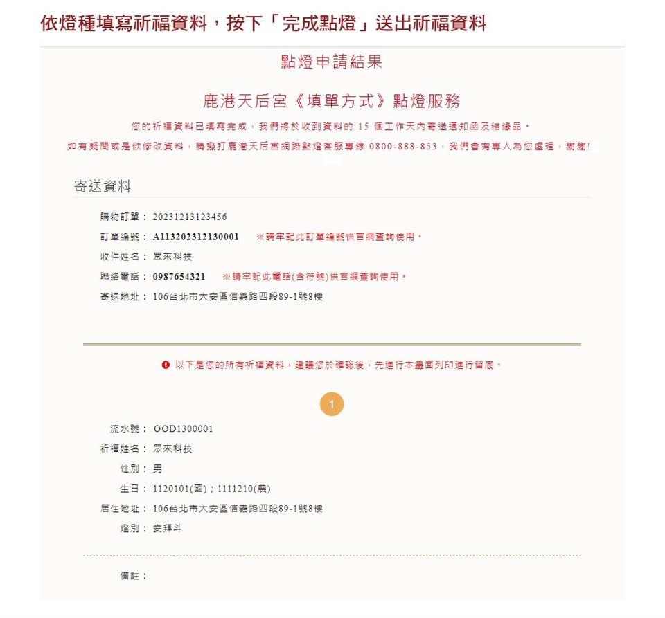 提醒您,請於下單完成後過二個工作天再至專屬填單網頁網址填寫祈福資料。