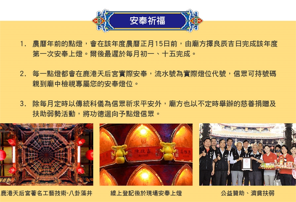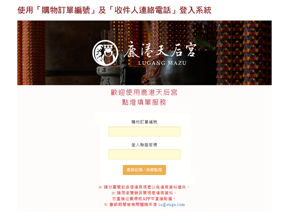 6. 如需修改點燈內容或有疑問,請於上班時間撥打鹿港天后宮網路訂單服務中心免付費電話 0800-888-853洽詢,假日及春節期間請來信 cs@otiga.com。