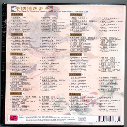 01.十面埋伏(古曲) 02. 梅花三弄(古曲) 03. 春江花月夜(古曲) 04. 妝台秋思(古曲) 05. 流水行雲(邵鐵鴻曲) 06. 漁舟唱晚(古曲) 07. 高山流水(古曲) 08. 雨打芭蕉(古曲) 09. 漢宮秋月(古曲) 10. 百鳥朝鳳(嘉祥曲)