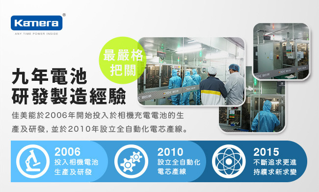 Kamera佳美能2006年開始投入相機充電電池的生產與研發,並於2010年設立全自動化電芯產線,採用高效能電芯自動化電芯產線生產,產品更進口日本IC晶片讓電池本身安全性更佳,出產前也會通過充放電循環測試,確認產品的使用效能;佳美能全系列電池已經投保3500萬產品責任險。