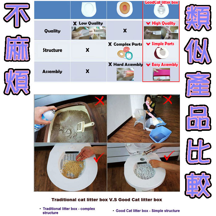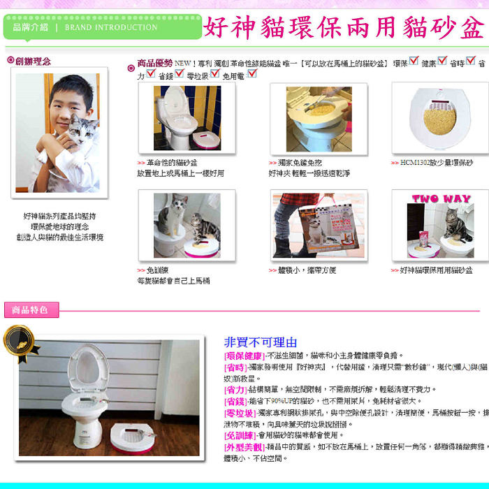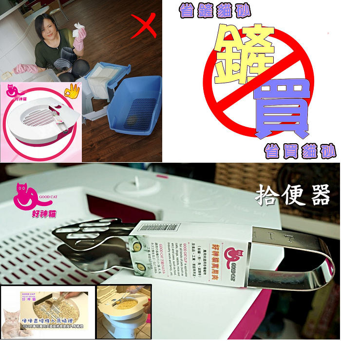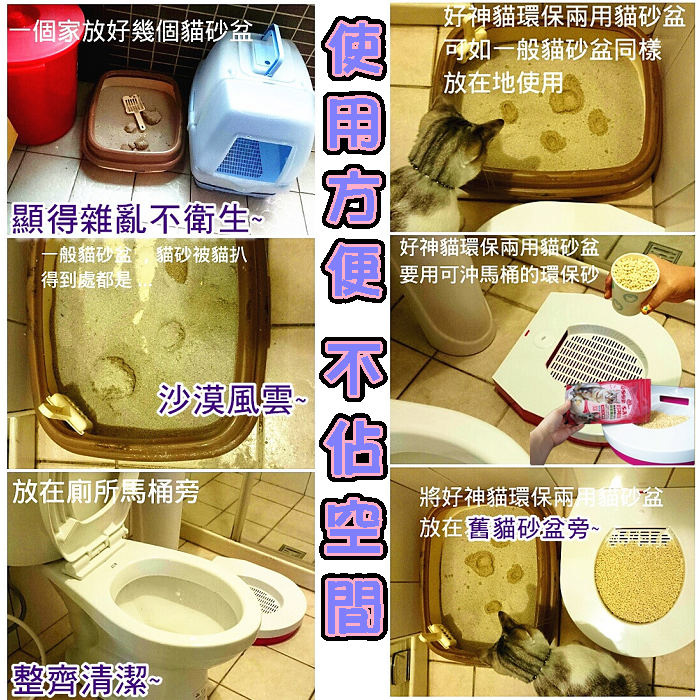 5、好神貓環保兩用貓砂盆,特別設計為(兩用),若不放在馬桶上使用,放置任何地方任一角落,都顯得美麗高雅,體積小且不佔空間,又好清理。詳見:說明書。