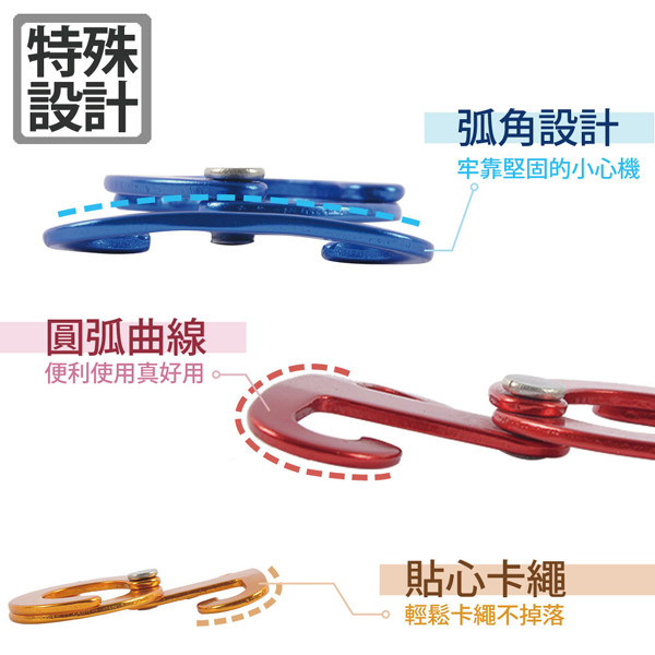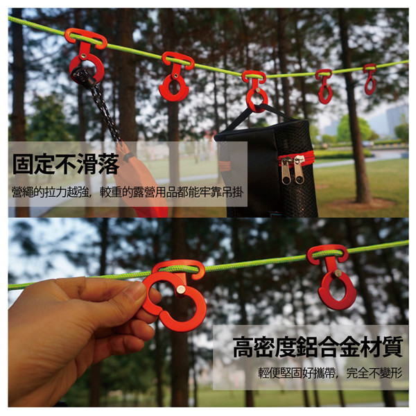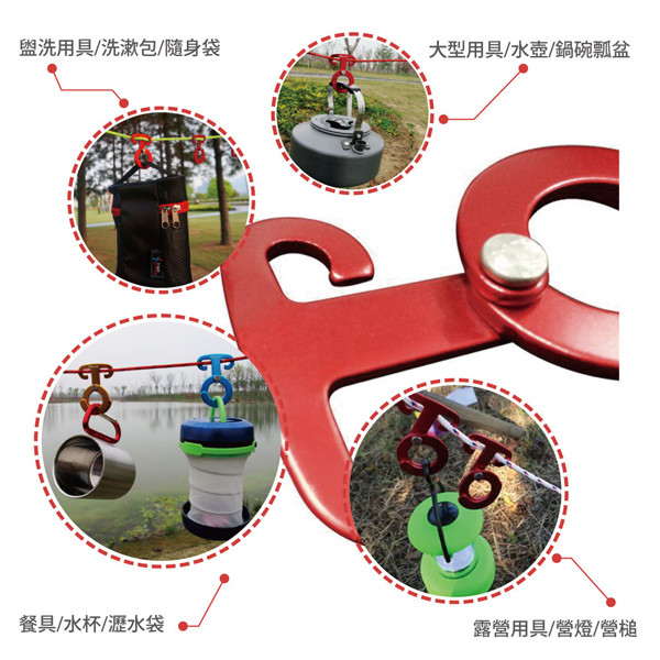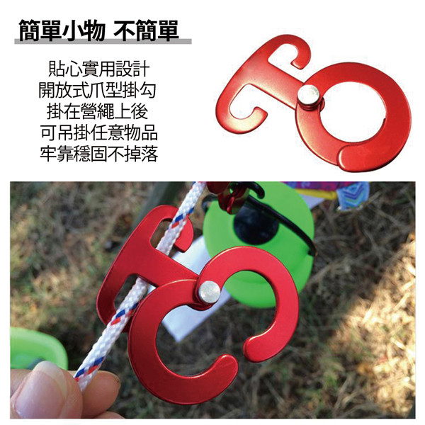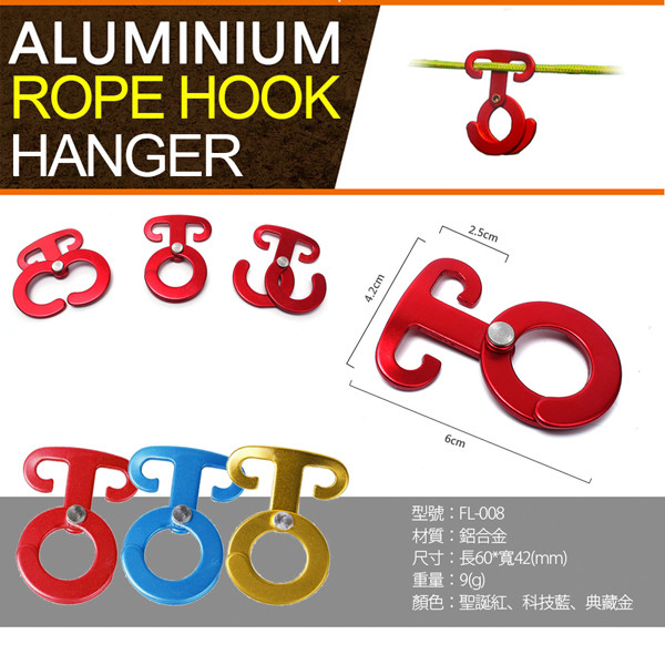 商品詳細介紹 超輕量航太鋁雙環式防滑營繩掛鉤(FL-008)【產品功能】●特殊弧度,安裝簡易,不滑動,不脫落。●雙半月環設計,吊掛簡便,物品不掉落。●適合營燈、鍋子、瀝水籃等吊掛。●輕量鋁合金製造,堅固耐用不變形。●陽極電鍍處理,亮麗不生鏽。●多種顏色可供選擇。 體驗說明 不可體驗 使用方法說明 無 注意事項 無