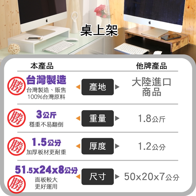 此款是特別針對小桌面,高工作量所設計出的收納架,專屬桌上收納空間,讓您以有限的空間,做最有規劃的收納。收納架有8公分高的空間及深度達24公分,可放置在電腦桌上當螢幕架或是印表機架,下層的空間可擺放鍵盤、檔案文件、文具用品及其他小物;擺在廚房裡可以將烤麵包機、熱水壺或是電鍋擺在收納架上,下面空間可放碗盤或調味料。無論搭配平面電腦桌,工作桌皆可搭配,實用性超高,經濟又實惠,真的是一舉兩得呢!表面採用PVC材質,防水耐磨的特性,讓您不怕因放置一杯飲料,讓置物架表面產生水痕。日系風格讓你不管搭配何種風情或系統皆得宜,書房、客廳、廚房皆適用,使用超方便,真的非常的推薦哦!