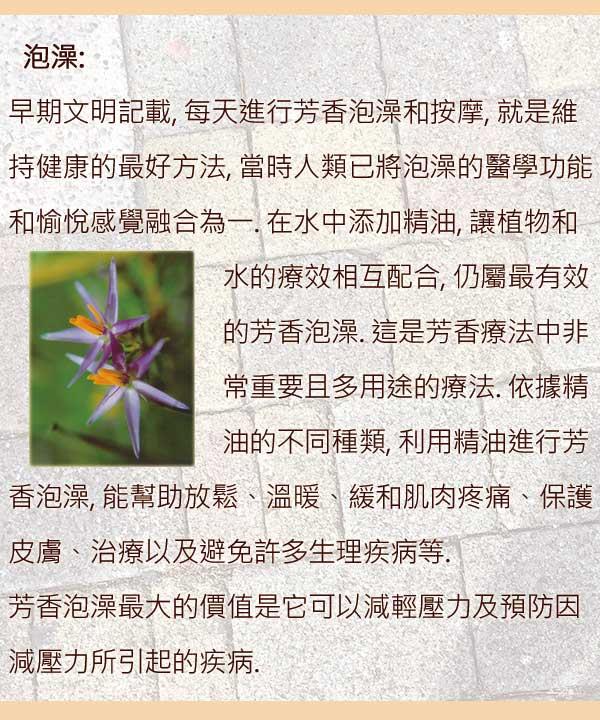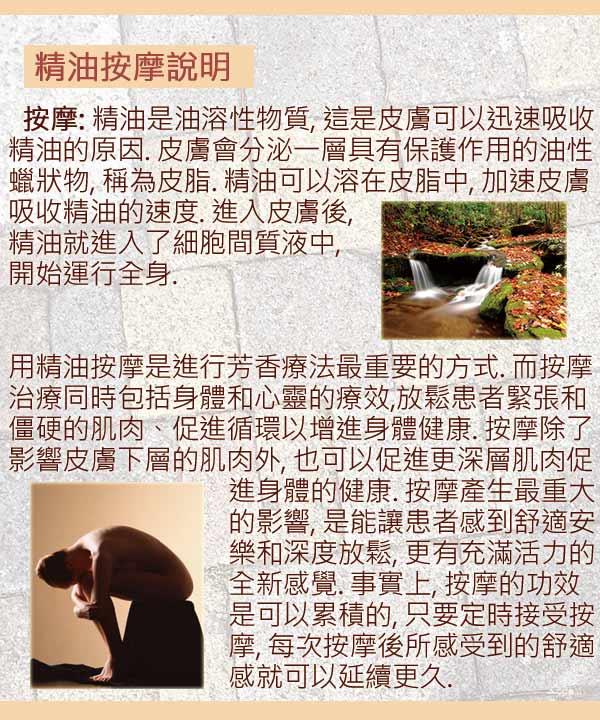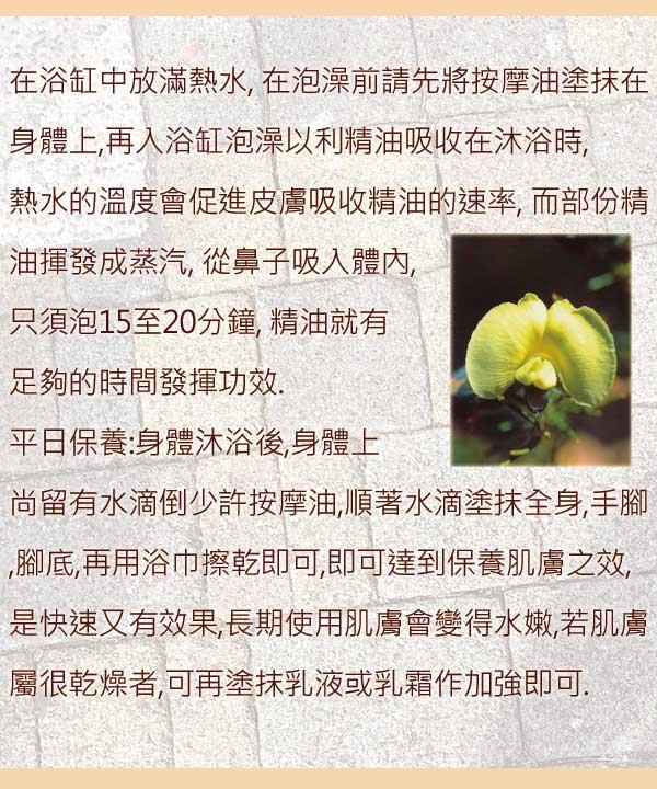 1.泡澡:請先將按摩油塗抹在身體上,再入浴缸泡澡以利精油吸收. | |