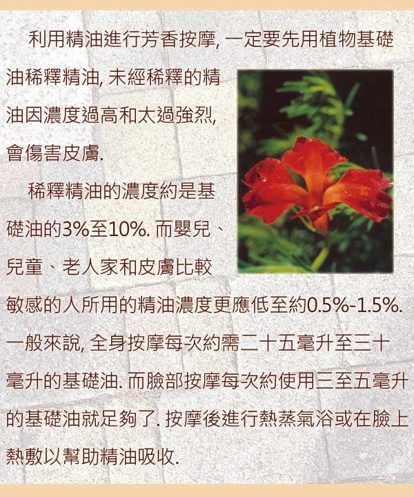 2.按摩:作SPA按摩後,因長時間按摩,身上殘留油脂會很多,肌膚 無法馬上吸收,可以直接沖水再用毛巾擦乾即可,不要再用沐浴 精沖洗,以免將精油洗掉,若是自已按摩,使用方式比照平日保養即可. 3.平日保養:洗澡後,尚有水滴倒少許按摩油,順著水滴塗抹全身或手腳 再用浴巾擦乾,若肌膚屬很乾燥者,可再塗抹乳液或乳霜作加強即可. 4.建議每二個月請換不同精油配方使用,可讓每次使用,精油可發揮最大效果. | |