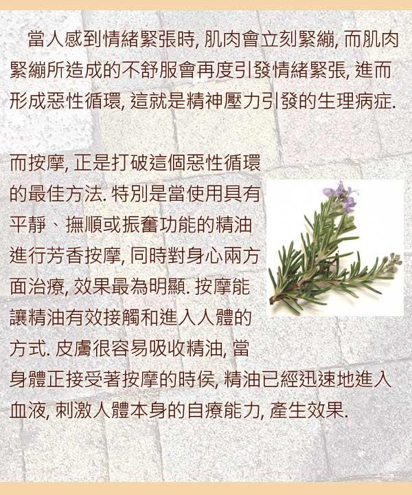 精沖洗,以免將精油洗掉,若是自已按摩,使用方式比照平日保養即可.