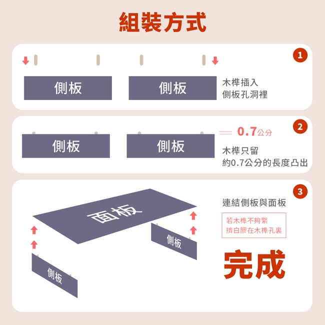 1. 先把木榫塞進側板孔位裡,凸出約7mm的木榫來連結面板。