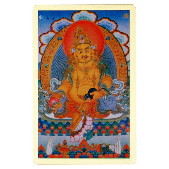 黃財神一面二臂,本尊形象為肚大身小,雙手有力,膚色金黃,右手持摩尼寶珠,左手輕抓口吐珠寶的吐寶鼠。