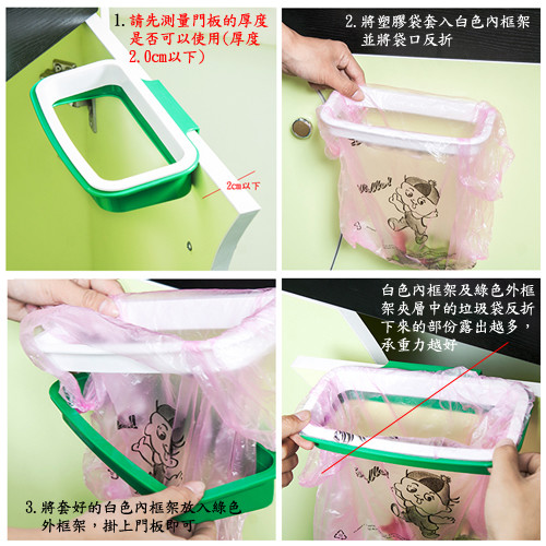 注意:白色內框架及綠色外框架夾層中的垃圾袋反折下來的部份露出越多,承重力越好。