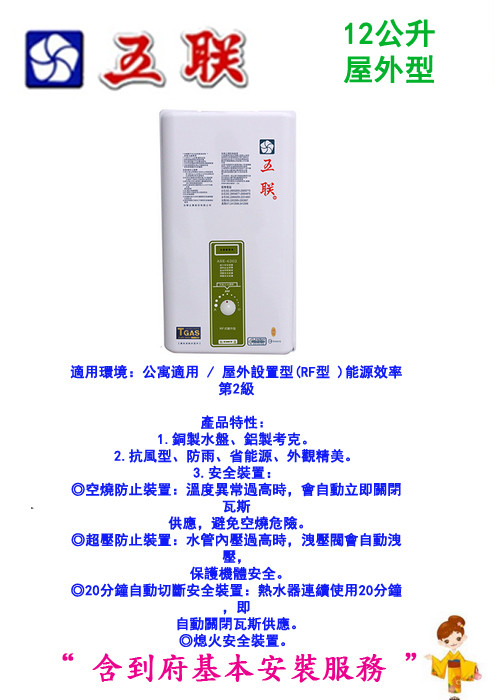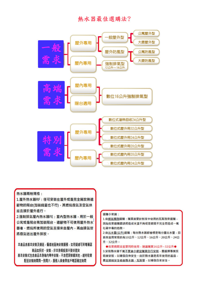 熱水器:購買前請先確認--住家使用瓦斯類型、使用空間(戶外或室內)、水流量大小,一經安裝恕不退換。