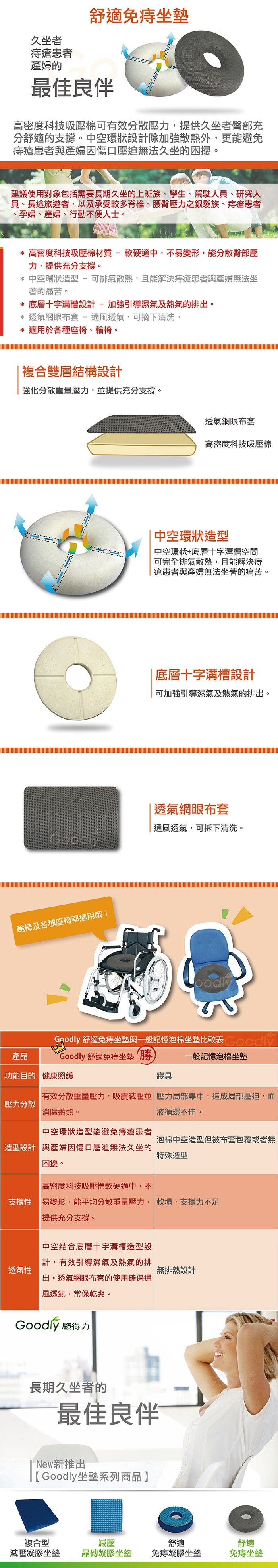 * 中空環狀造型 - 可排氣散熱,且能解決痔瘡患者與產婦無法坐著的痛苦