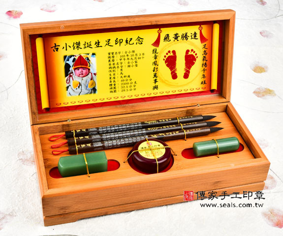 一. 品名:頂級天然竹盒+足印相片+豪華精雕胎毛筆3支+發財章全手工篆刻2顆
