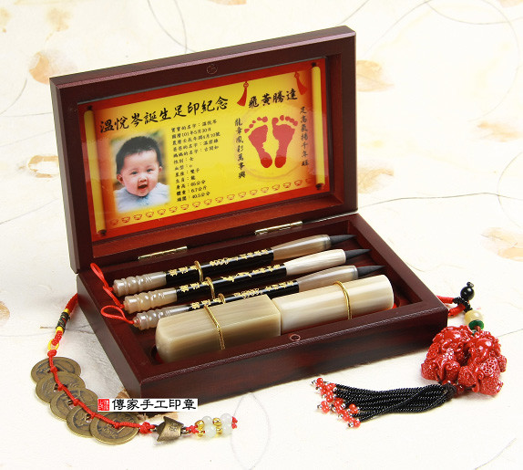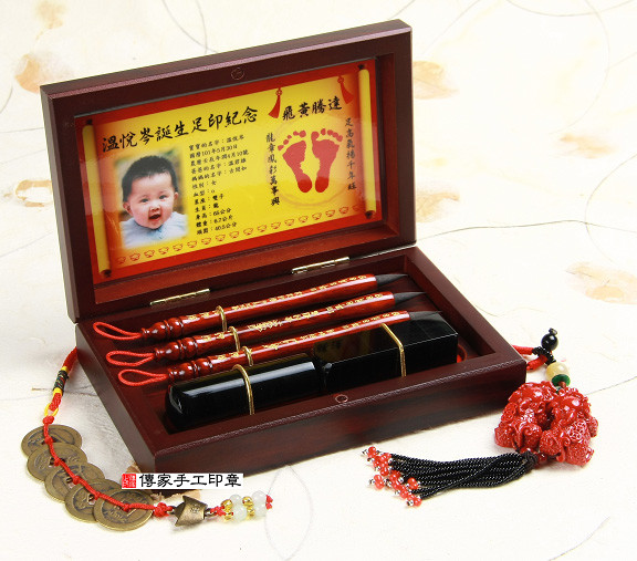一. 品名:【袖珍型嬰兒三寶】精美木盒烤漆+足印相片+經典胎毛筆1支+發財章電腦刻1顆