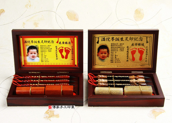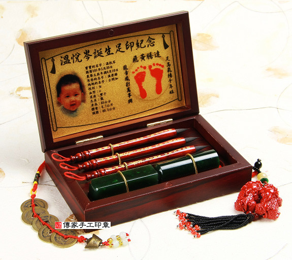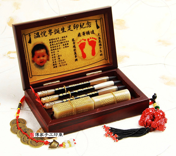 一. 品名:【袖珍型嬰兒三寶】精美木盒烤漆+金箔足印+經典胎毛筆2支+發財章全手工篆刻2顆