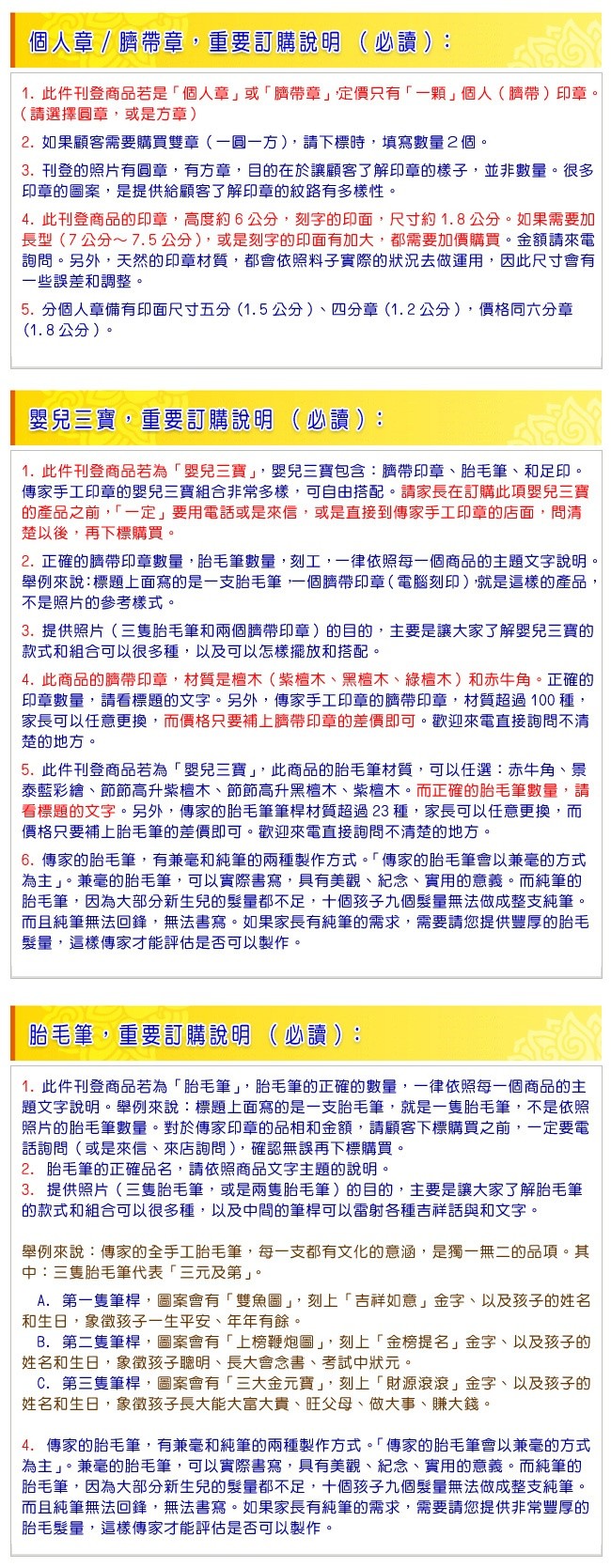 3. 訂購須知(必讀):品項、數量、刻工、印章的紋理和獨特性、品質保證說明。