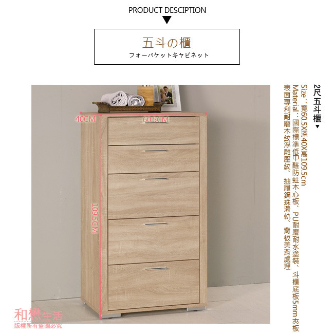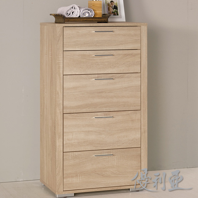 【優利亞-格瑞絲】2尺五斗櫃~簡約柔和的時尚線條,極簡風格的獨特品味,增添臥室空間的高質感。主結構採用低甲醛防蛀木心板結構堅固不易損壞,塗裝採用優麗坦耐磨、耐水塗裝,貼皮採用專利技術耐磨木紋同調浮雕壓紋觸感彷佛實木一般的高質感;五抽櫃的收納大容量結構,讓您不必再煩惱家裡物品及衣物的收納空間,放置私人物品,多格置物空間,可收納各式用品,有效節省空間,不怕凌亂!此商品非DIY組裝設計,品質有保障。現在購買專人送到府服務,免組裝,讓你省時省力省運費!
