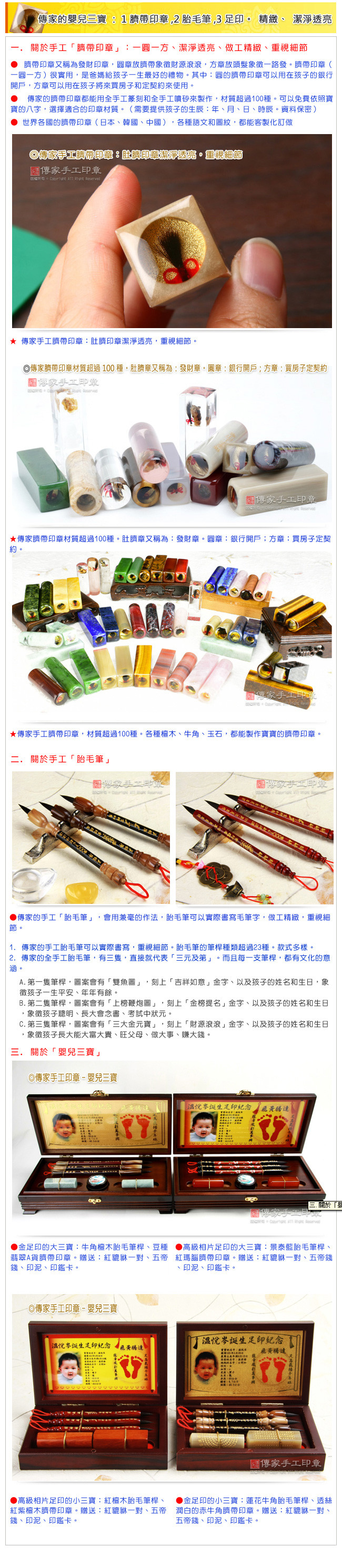 ● 嬰兒三寶的搭配非常多元,賣場裡的嬰兒三寶臍帶印章為「檀木類」臍帶印章、及「赤牛角」臍帶印章,兩種可以任選,胎毛筆有23種以上款式選擇,下標後會再和您確認款式。