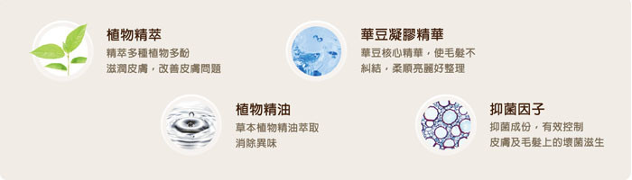 以純淨草本精華,搭配植物精油,能真正有效抑菌消臭,且溫和地滲透到毛髮及皮膚,充分給予毛髮與皮膚最佳的滋養與保護。清新持久的植物香氛,幫助舒緩心情,呵護寶貝且散發迷人風采與獨特魅力。 成分‧功效